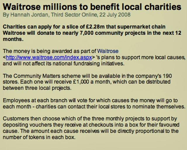 We really like this. Not only is it generous, original and inventive, it also encourages local giving to lesser known causes. It involves a neat way of ensuring that the public are engaged in choosing where the money goes and, in so doing, Waitrose customers are obliged to find out a bit about each cause before they choose. Who says corporate donors are mean and self-centred?