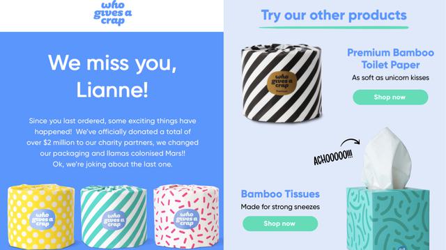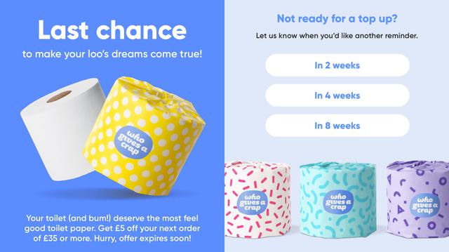 I started ordering my loo rolls from Who Gives a Crap (WGAC) in 2019 and when the lockdown came into play in March 2020, I was feeling pretty smug. Having been introduced to WGAC through a friend referral, I was impressed by the amazing email journey that they put me on. I wish I had thought of it.