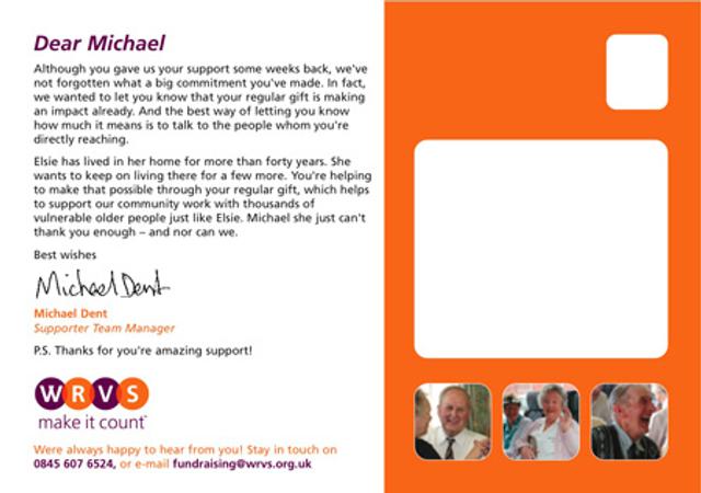 Early attrition is a recognised issue for face -to-face fundraising. It has become almost acceptable that up to 50 per cent of signed-up donors will just fail to make more than one or two gifts after recruitment. Working with WRVS, we developed a series of three digitally personalised A5 sized postcards that are sent after each of the first three direct debit claims, to reinforce the importance and significance of the gifts. Compelling text on the reverse and a powerful image ensure the donor is left in no doubt of the value of their support.