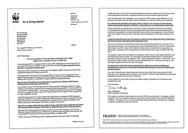 Visual impact was provided by two images of a snared tiger, which were enclosed in another manila envelope – this one bearing a handwritten warning about their contents. The idea was to prepare donors for a shock and ensure that they looked at images that not only dramatised the need but also connected them directly to WWF field staff.