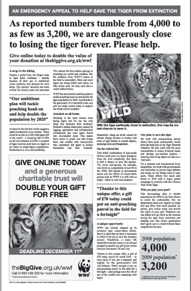 To maximise the impact of such a dramatic fall in tiger numbers WWF and Open Fundraising launched a fully integrated emergency appeal to core, mid-value and regular donors. In addition, full-page adverts were run across the national press and WWF’s online networks were activated.