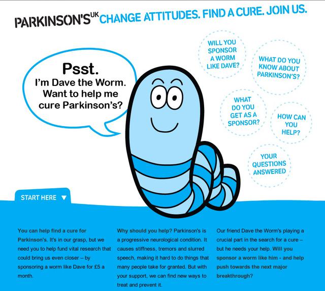 Dave il Verme e’ un personaggio divertente e arguto che ha permesso all’Associazione Parkinson Inghilterra di diventare competitivo rispetto ad altre NGO. E cosi’anche il tema della ricerca scientifica diventa interessante e coinvolgente tanto da convincere i sostenitori ad attivare una donazione regolare a favore della causa.