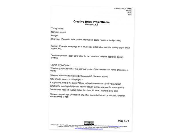 This creative brief comes courtesy of Lisa Sargent, principal at Sargent Communications, LLC in the USA.