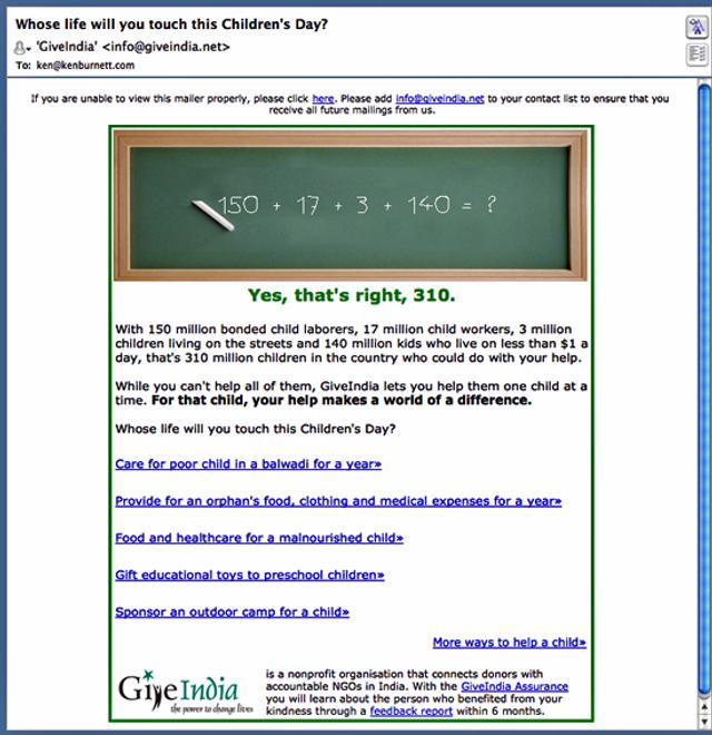 E-mailed newsletters are common nowadays but few have the simple directness and sheer appeal of this example from GiveIndia. GiveIndia's October 2008 newsletter starkly presents the great social challenges that face the sub-continent, but then it succinctly encourages donors by showing them how they can get involved and make a difference.