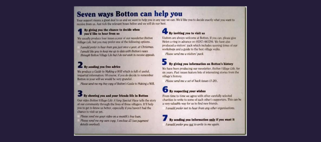 Until Botton Village started offering its donors choices with the simple form shown opposite, donors everywhere were almost invariably not given any say in how they might be communicated with.