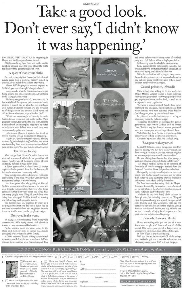On one awful night in 1984 the Union Carbide factory in Bhopal, India exploded sending clouds of poisonous gas across the city that would kill tens of thousands of people and inflict misery and suffering on future generations. Thus began the Bhopali people’s search for justice and treatment, which led to the founding of the BMA, whose advertisements have become the symbols of a crime that, more than 25 years later, still inflicts unimaginable suffering and still goes unpunished. The Bhopal Medical Appeal campaigns to change this, through its fundraising.