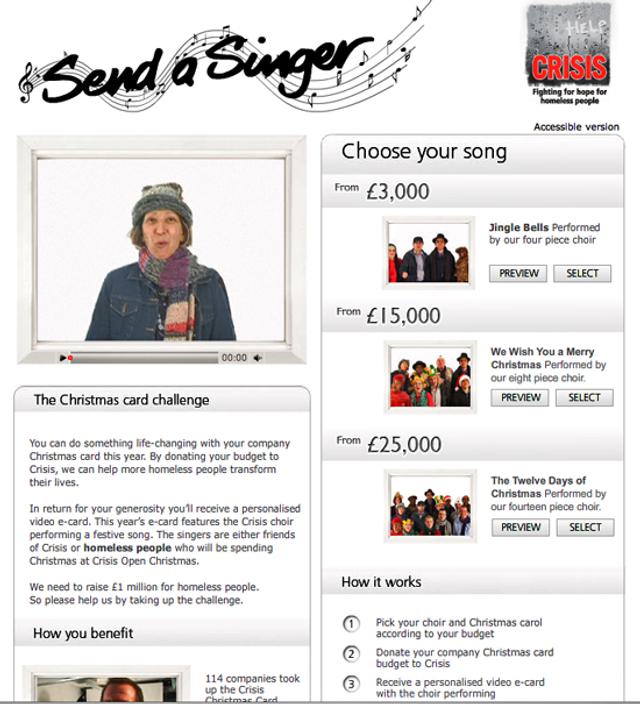 'Send a singer’ is one example from a charity for homeless people in the UK – it’s fun, it’s engaging, it’s compatible with the charity’s values. In essence this campaign addresses corporate social responsibility agendas, offers a practical solution to the traditional Christmas card chore and offers participating companies a unique and high impact marketing opportunity.