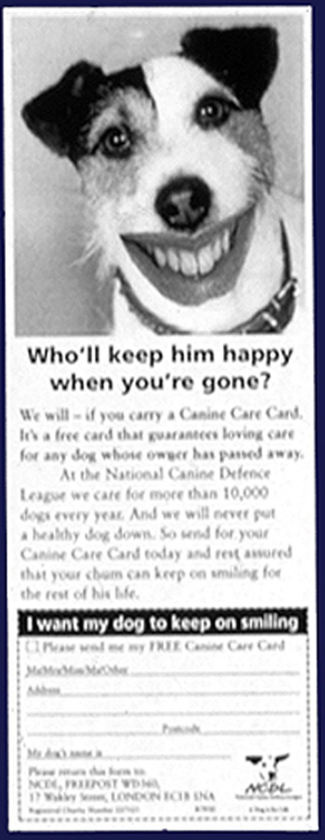 This is really clever fundraising. The Dogs Trust (formerly National Canine Defence League) offers its supporters the chance to join their canine care scheme which ensures that if they die before their beloved pet dog, NCDL will promise to look after the dog for all its natural life. Is that idea going to appeal to an elderly dog-loving donor? We think so. So, which charity is that dog-loving donor likely to leave a legacy to, then? There are no prizes for getting this right, unless you are The Dogs Trust, who've raised £millions from this scheme.
